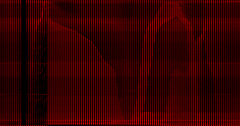 Audio - I wanted a sound track that was slightly dark and was modulated by the video. Tech: To have the video drive the sound I created Nato patch to analyze the pixel intensities of each frame (with 242.histo) and generate a "videogram" where each frame maps to a column of pixels in the videogram. I used this "videogram" to synthesize the audio track in Metasynth with a square wave sound sample and much resonant filtering. Assembled final movie with Quicktime. The videograms by themselves are interesting. Below is a section of left channel videogram, corresponding to about 30 seconds worth of video. |