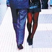 Tango dancers . Calle Florida, in Buenos Aires. This photograph has been modified to look like a night photo. It was actually taken during the day. Click thumbnail to view a larger picture. Recently (2002) I saw a picture of the same characters in The Economist. The similarities between the body and facial expressions of the crowd in the two pictures, probably taken two years apart, are striking. Click here to compare and contrast. |