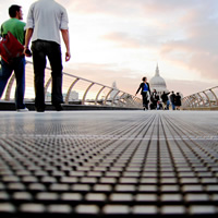 Millenium Bridge. London. St. Paul's cathedral can be seen at the far end of the bridge. Click thumbnail to view a larger picture. |